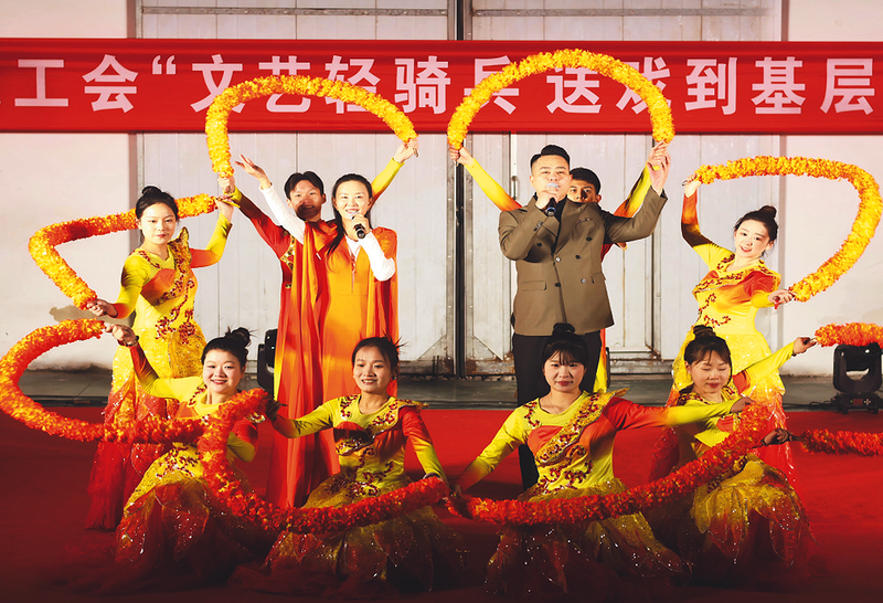 ??近日,山東省東營市總工會“文藝輕騎兵送戲到基層”慰問演出走進中鐵三局東營港疏港鐵路東營港站。施工一線的近百名員工齊聚觀演,在緊張工作之余共享文化盛宴。圖為慰問演出現場。宋慶達 攝